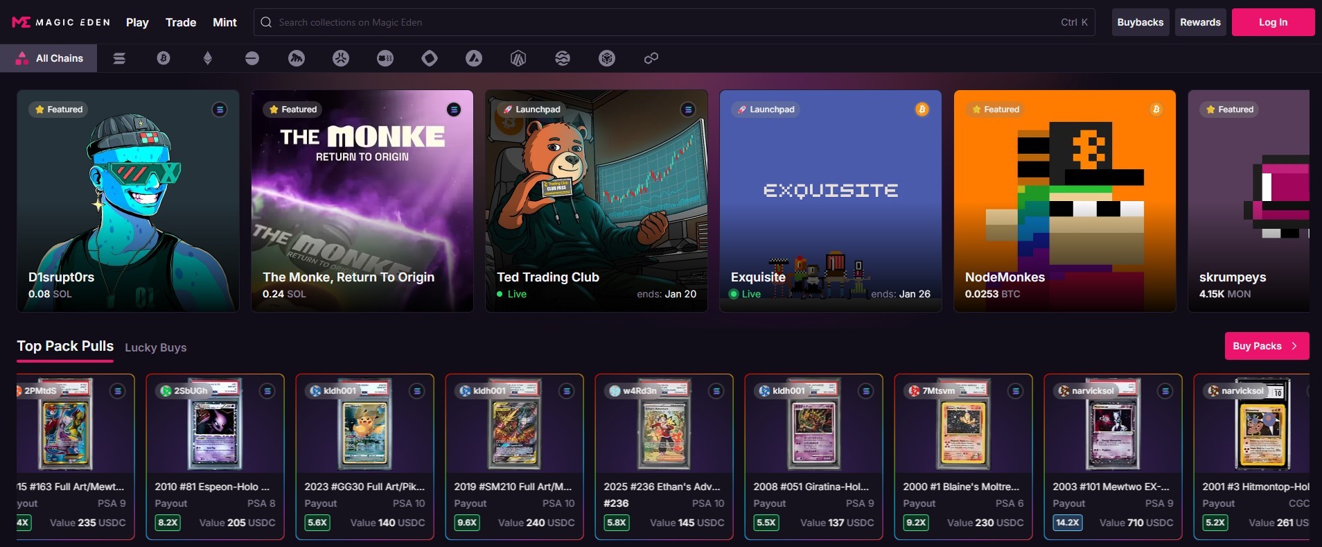 Magic Eden | Solana, Ethereum, Polygon, Bitcoin Ordinals | Art, gaming NFTs, Ordinals | 1.5% trading fee | Solana and Ordinals traders |